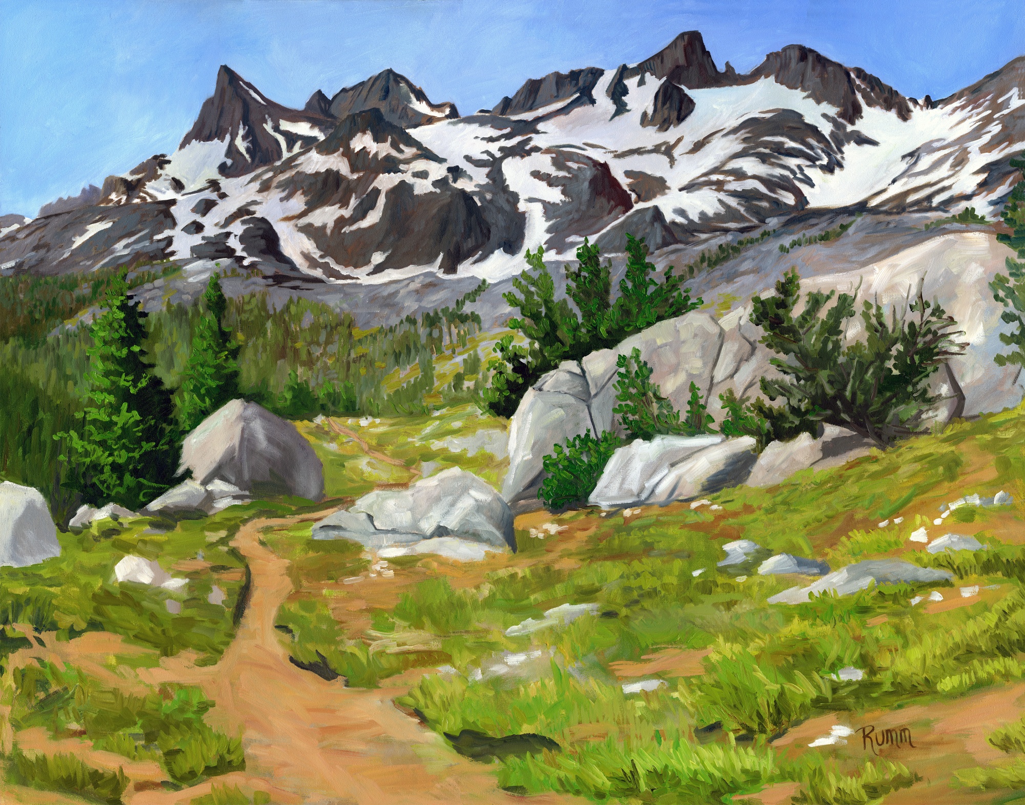 I started this painting and halfway through, kind of lost my feeling for it. I broke away from all the obligations of home life and escaped for a short backpack. I ended up at this very view and the lush colors of the meadows and dark mountains took my breath away. I could hardly wait to get home and finish the painting!