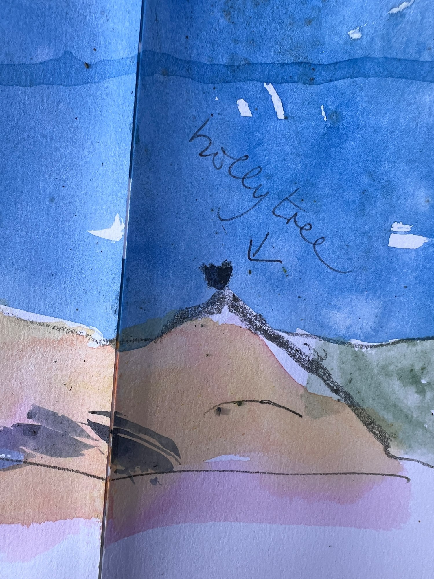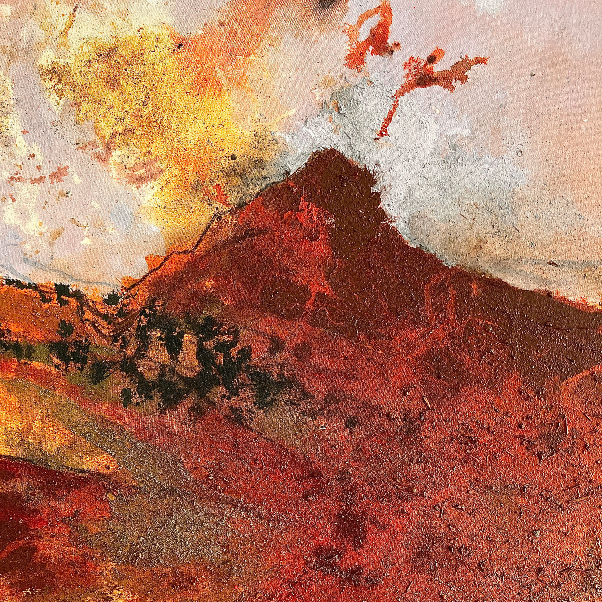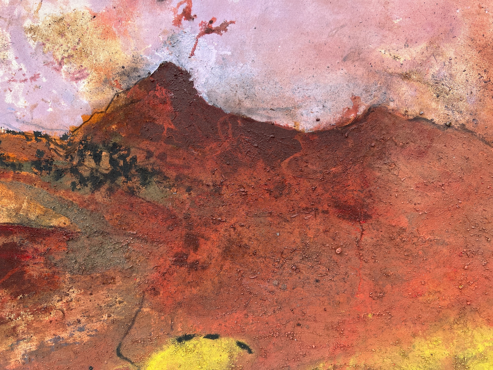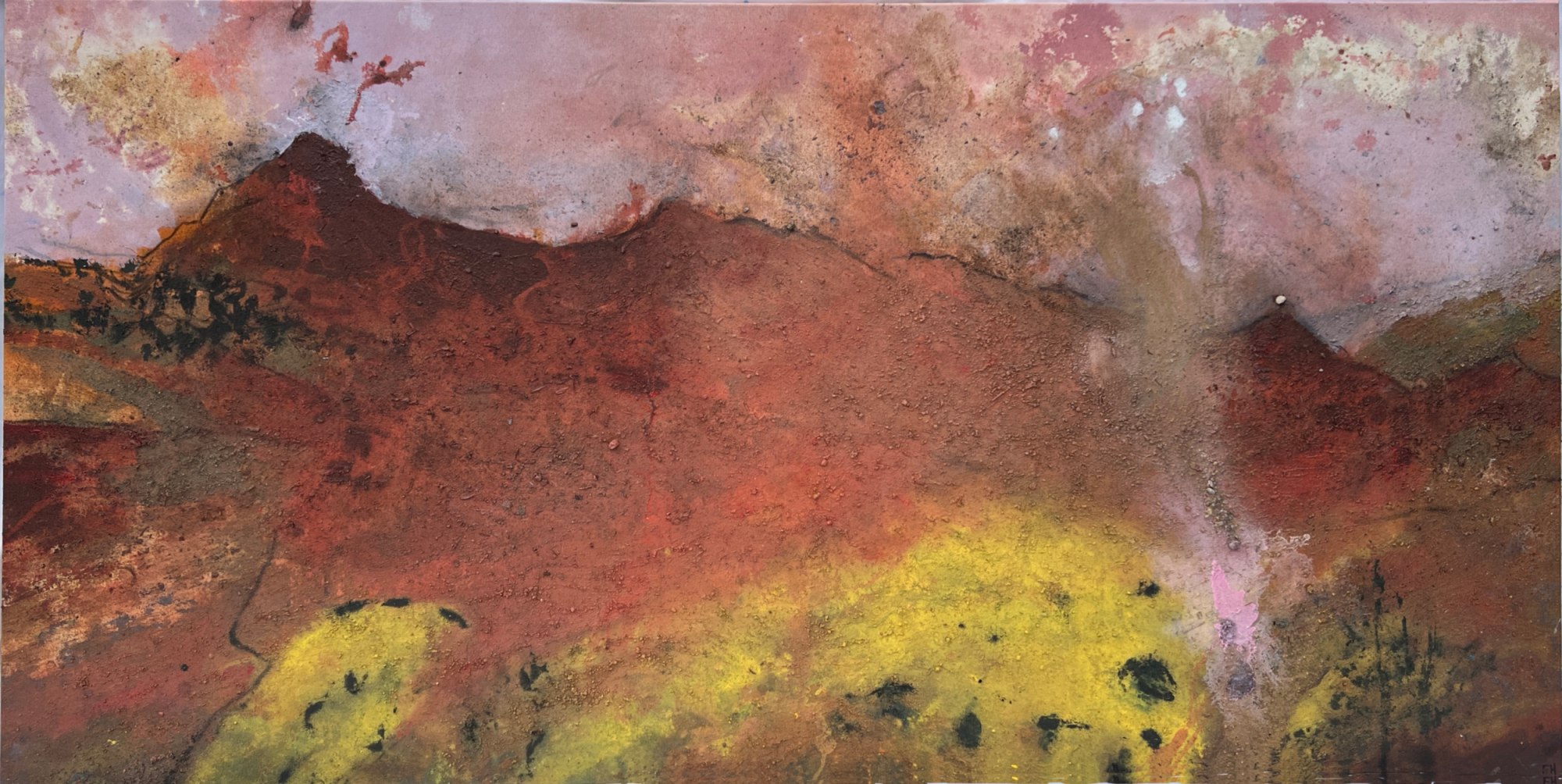 A storm passes over the September mountain. The canvas is unstretched while I work so the paint gathers in the unevenness of the terrain. I establish the topography before the weather softens the definition. Before this painting was made, I walked up to the rise on the left known locally as Bell over to the little hillock on the right (that doesn't have a name I know of) collecting a few samples of earth as I moved. It has a holly tree (a few actually) emerging out of the shelter of piled rocks on its peak. A small rock from the site sits on its summit in the painting as a salute to that community of sturdy holly. This is a site of disturbance, the fragrance of bracken and a disappeared mining community. Peppered with miineshafts and spoil. The aura of copper/bracken/dirt infuses the air.