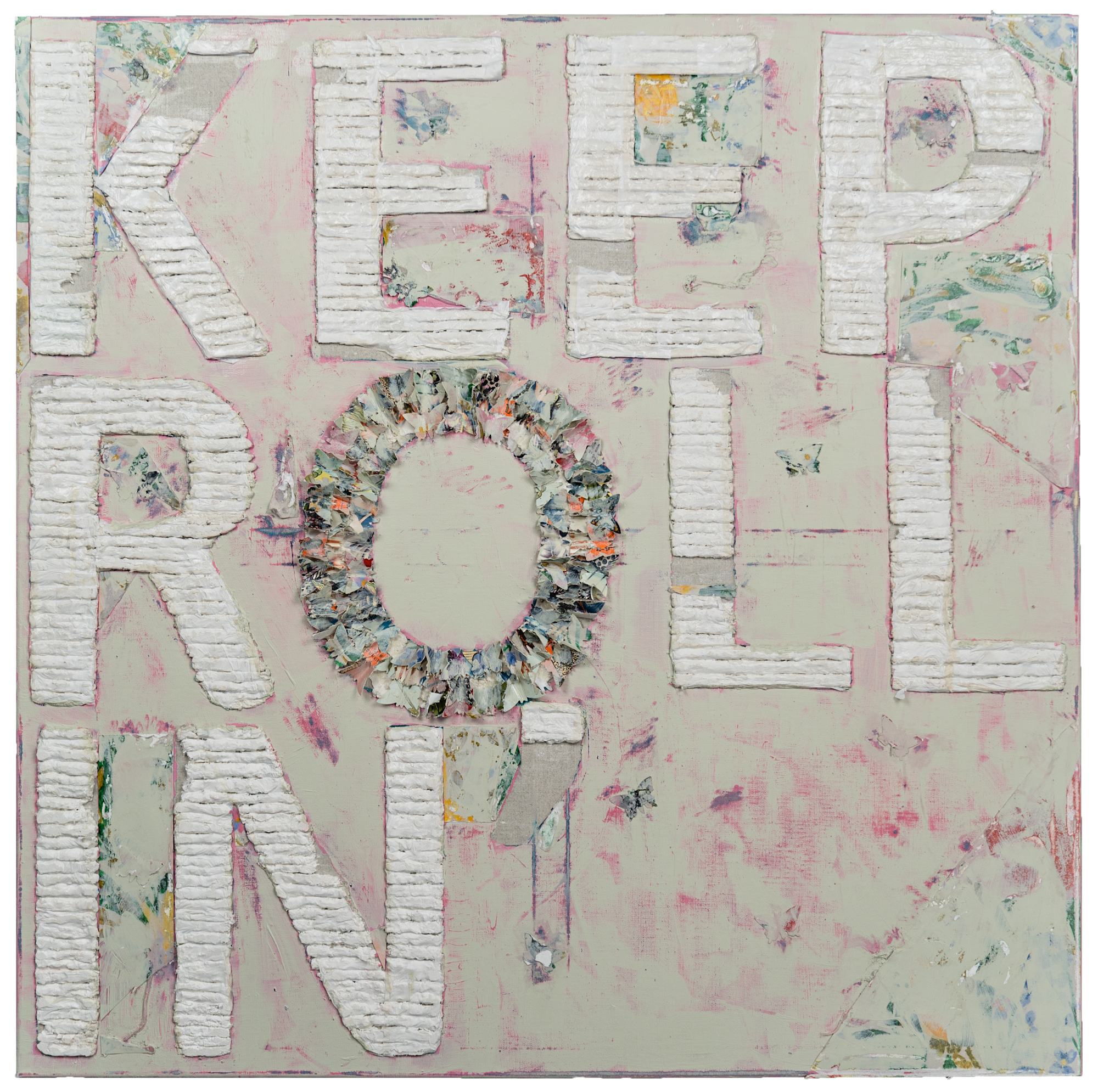 • acrylic, paper mache + collage on canvas under acrylic frame
