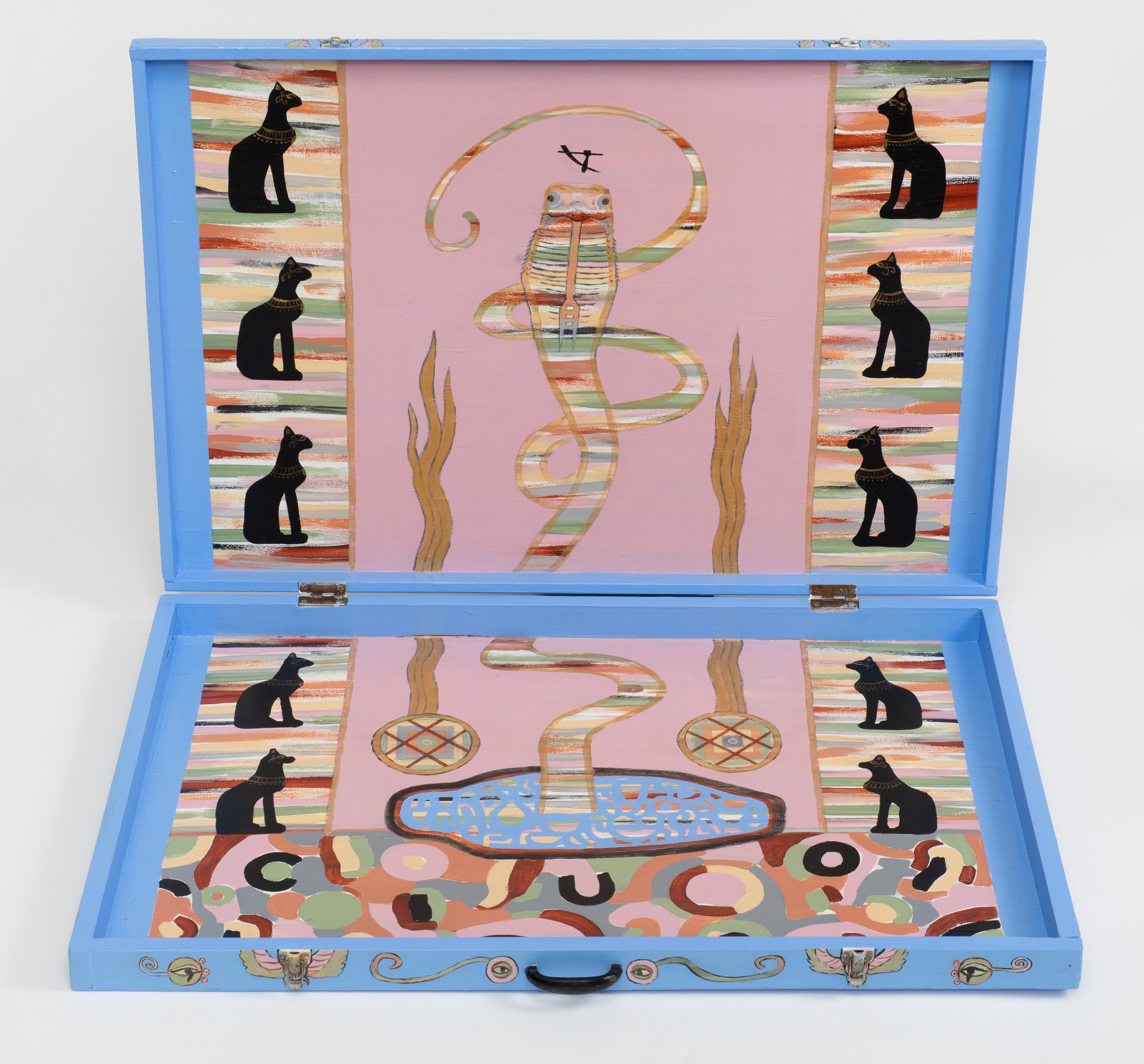 This unique artwork is painted on all sides. I created the middle section depicted here in response to my first significant dream from December 2020 where I had an intimate encounter with a snake. it also references my second significant dream of the dying sphynx.