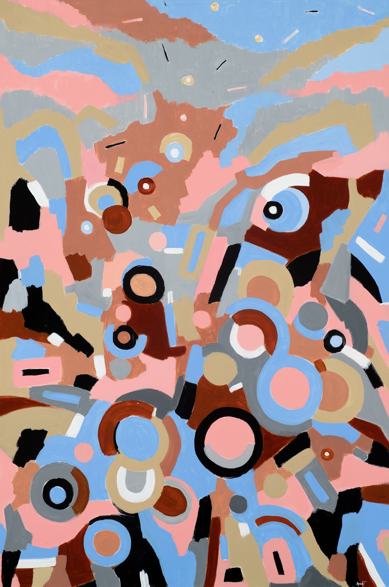This is the first work created in this collection. It was a few months into the pandemic and I was working from home as a psychologist. There was a tsunami of need in the community and it was coming right at me. Old clients were returning along with a flood of new ones. It was hard to turn anyone away and a lot of people were financially stressed having lost their jobs. So I started to use acrylic painting to let out my feelings.