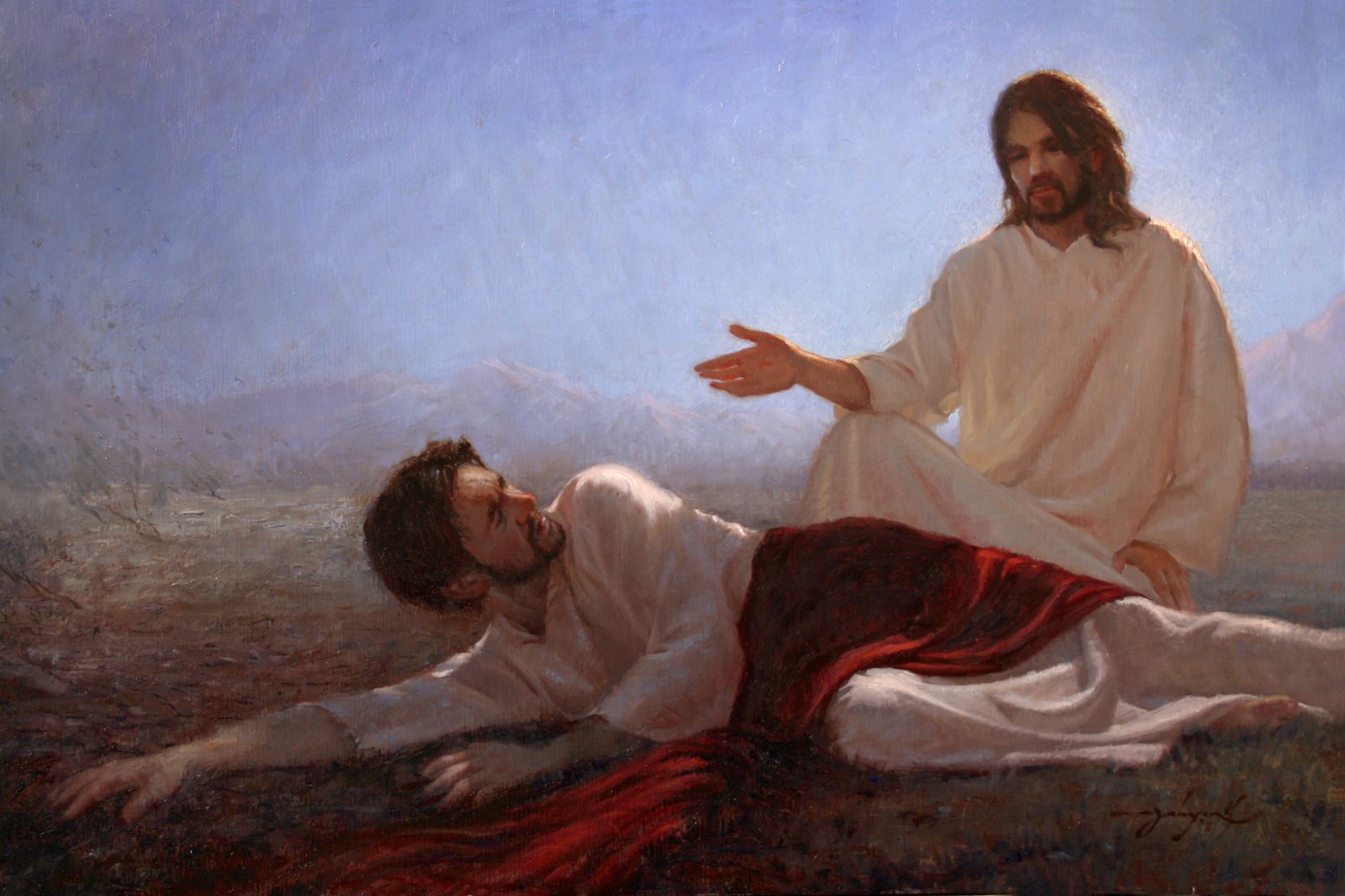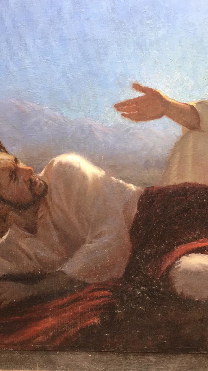 This allegorical depiction of repentance aims to show how, when we’re in the mire of sin to some degree, there is Help waiting. Although a man is depicted in the mire here, he represents any of us, male or female. Note how the red garment in this piece (representing sin) passes over the man, but is also in the shadow of Jesus—and its placement relative to Him is symbolic. Because His blood flowed in Gethsemane (like the garment flows in the painting), our raiment can shine white under His care. Soon, we will be lifted up, and our entire wardrobe (natures) will be completely changed, pure and white.