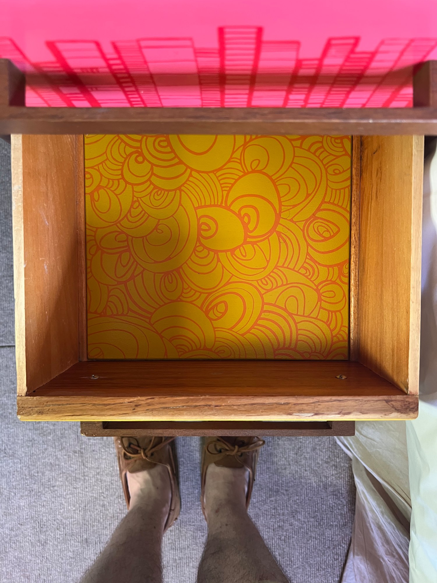 Through her re-use of mid twentieth century furniture pieces and patterns inspired by Formica clad sea-side cafes, her work takes on an appropriate nod to the fifties. Bright colours and optimistic images are printed onto re-veneered drawers, footstools, side tables, and Formica wall pieces. Particular emphasis is placed upon the importance of re-using as much of a material as is possible. As well as having designed a range that is visually appealing, her work is also ethically strong and offers a more ecological alternative to the ‘throw away’ designs of today.