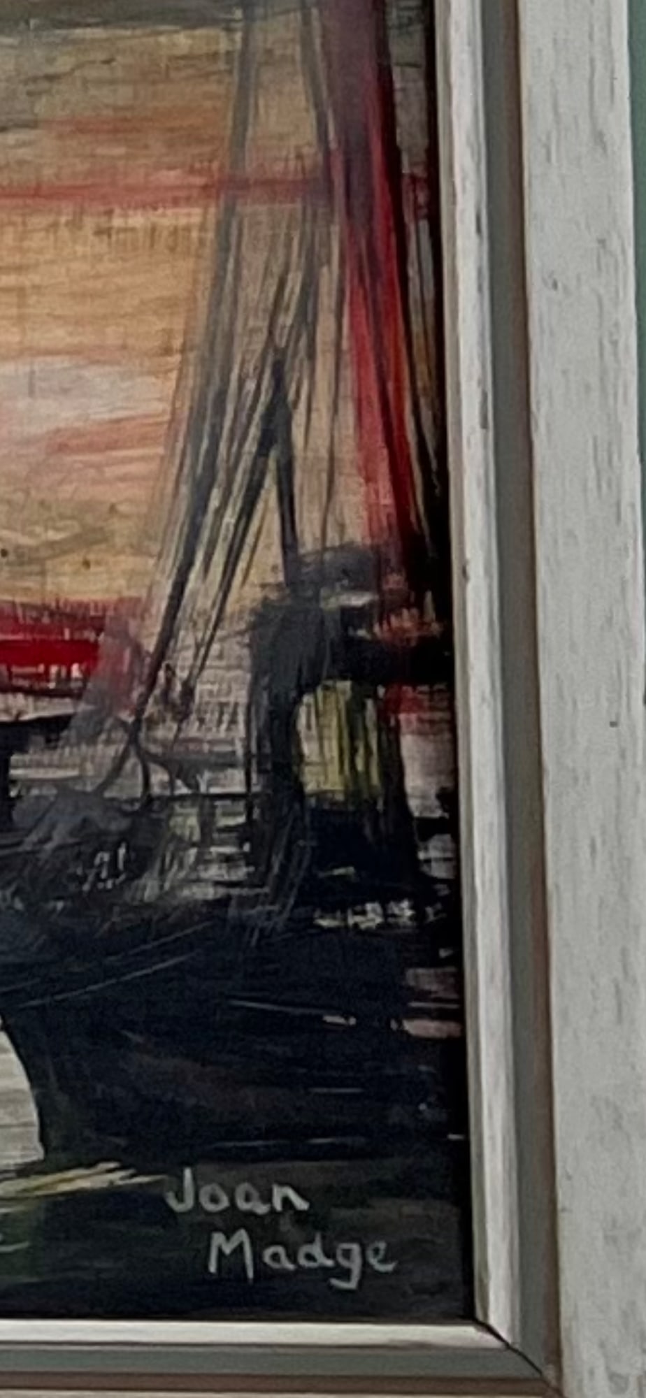 Joan Madge (Mrs J Winlove-Smith of Crooklets, Bude) has painted for a number of years, following an art training in Sussex, Plymouth School of Art and the Central Schoolof Art (London). Her work became known when her painting "Homage", depicting the Lying-in-State of the late Sir Winston Churchill, was purchased by His Grace the Duke of Marlborough. This painting now hangs in the birthroom of the late Sir Winston Churchill at Blenheim Palace. She also painted in Greece with studies of the Greek Islands, the Aegean Sea and Athens, as well as the more familiar landscapes and sea-scapes of Cornwall and Devon.