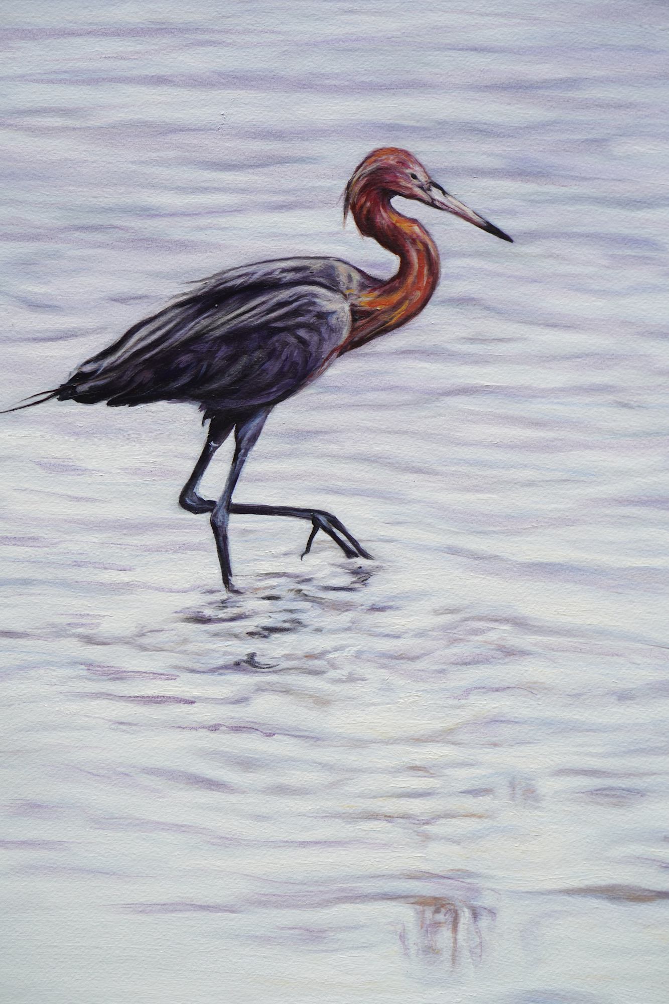 Painted from observation and photographs gathered on the Laguna Madre, Reddish Walking follows a Reddish Egret tracing light patterns across shallow water. The elongated composition enhances the sense of motion, while muted tones evoke the quiet brilliance of coastal dusk.
