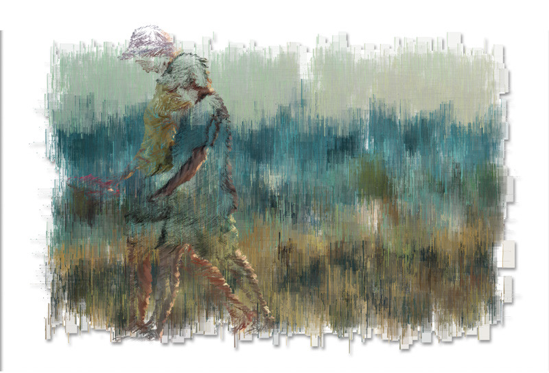 It's a weekly ritual. They walk and talk, engrossed in conversation and reverence. Every Sunday they take to the beach. They are all but invisible as they become one with the sand, the ocean, the cosmos. This composite image is abstracted using a digital synthesizing technique. Individual custom brushstrokes are applied by a program, using data from photographs. Post production ensues.