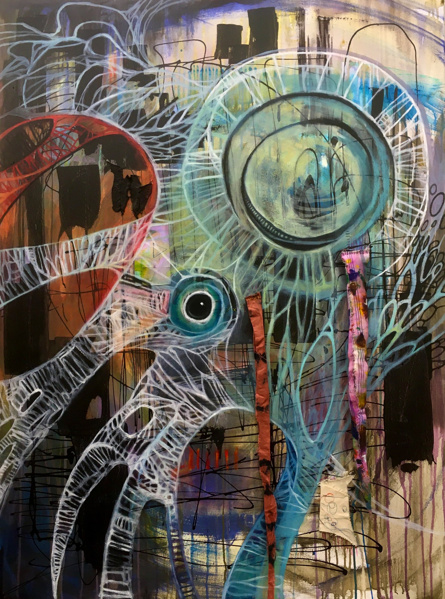 A large piece with many layers of automatic creation. I let loose on this surface many times, adding mediums by whim. There are scraps of cloth and leather sewn in as well.