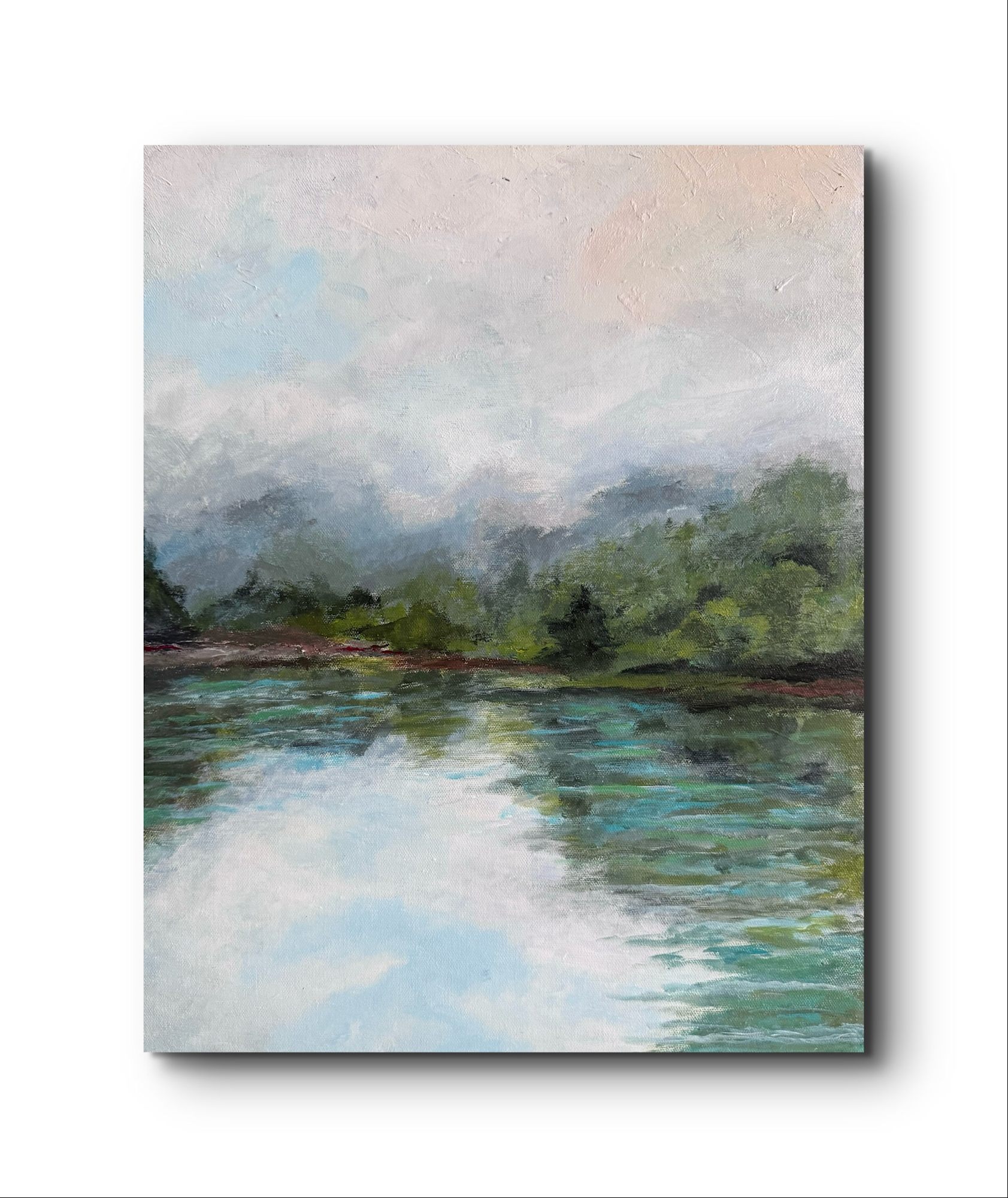 The artwork is a serene landscape painting featuring a tranquil body of water reflecting the surrounding scenery. The background consists of a lush, green forest that gradually transforms into misty hills, creating a calm and atmospheric depth. The soft blending of colors, ranging from greens to subtle grays and blues, evokes a peaceful and natural setting. The artist captures a harmonious balance between the vivid reflections on the water and the gentle tones of the mist-covered landscape. ©️Philip Gangler, all rights reserved.