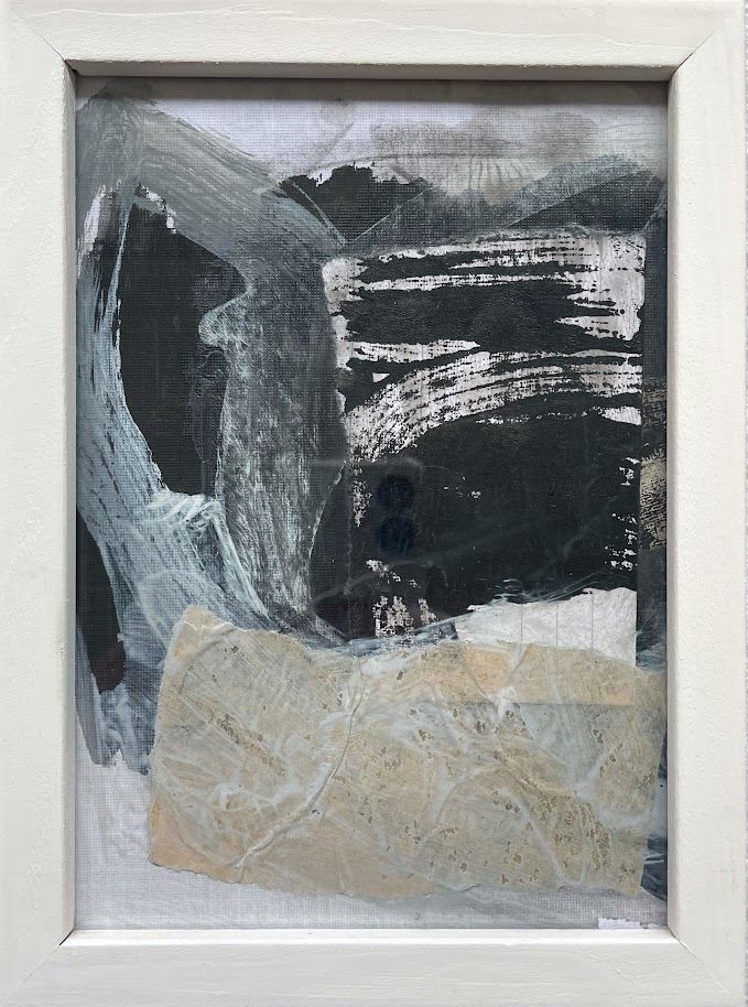 I started this small series of new works in early February 2025.  Ultimately creating seven new small mixed media collage works on paper and framing them in simple white frames. You can display these pieces on your wall or on a shelf or table as they are free standing.