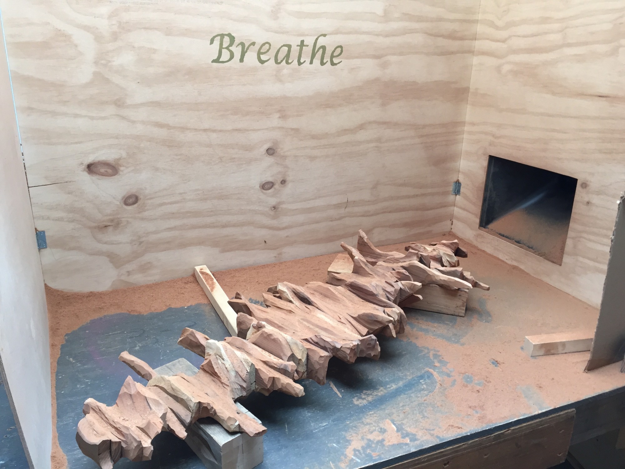 Here you see the carving and sanding station which I have set up in my studio to contain and collect the wood dust. The carving requires a full protection suit and equipment (ears, eyes and mouth).