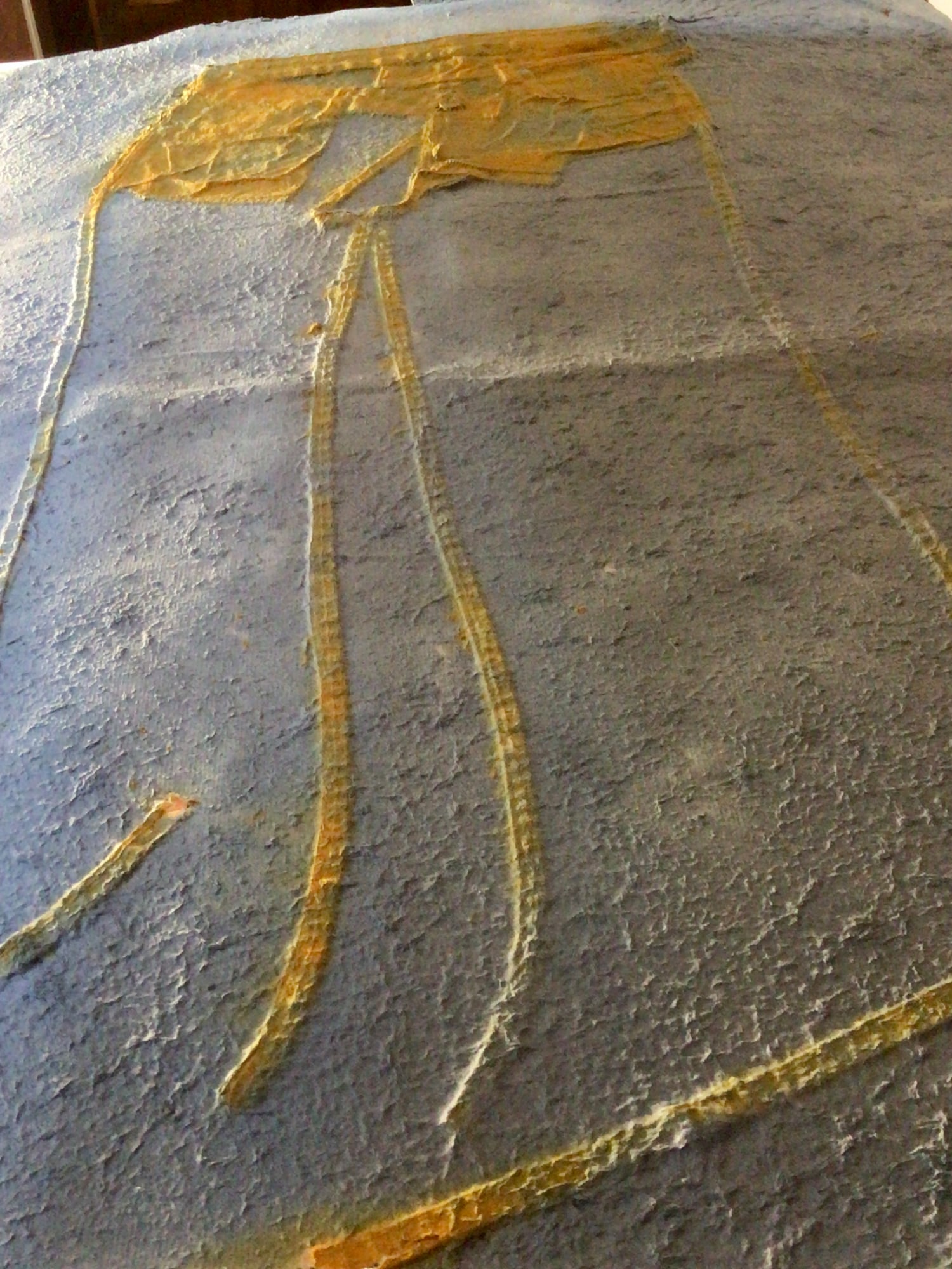 "For Flags" consists of four different pulps created from four pairs of pants, rusted and useless. Displayed in a row of flags, the piece explores patriotism and the utilitarian turned functionless as well as industrial advances, fashion, and our shared history of labor in a common American work garment. Each color is a result of pulping separate pairs of the artist's used work pants. The image was created directly from the seams of the same pants by applying and rusting an iron coating. Sheets were produced in the artist's vacuum table.