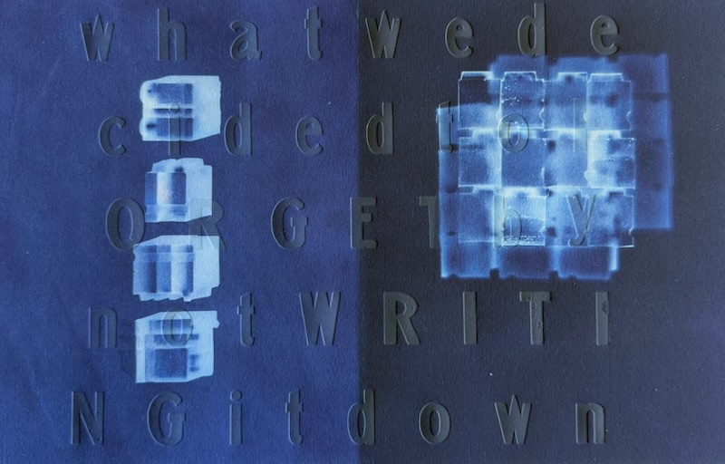 This project is a creative collaboration by Ayumi Ishii and Kate Copeland. We started with lead type (Spartan Heavy 48 point), made a silicone mold directly from the type, and then cast clear resin type from the silicone mold. We then used the clear resin letterpress type to create cyanotypes on Hahnemühle sumi-e paper; we translated the cyanotypes through inkjet in small editions; and we letterpress printed on top of that with wood type (Fancy Gothic 60 point) using transparent base on a Vandercook Universal I.