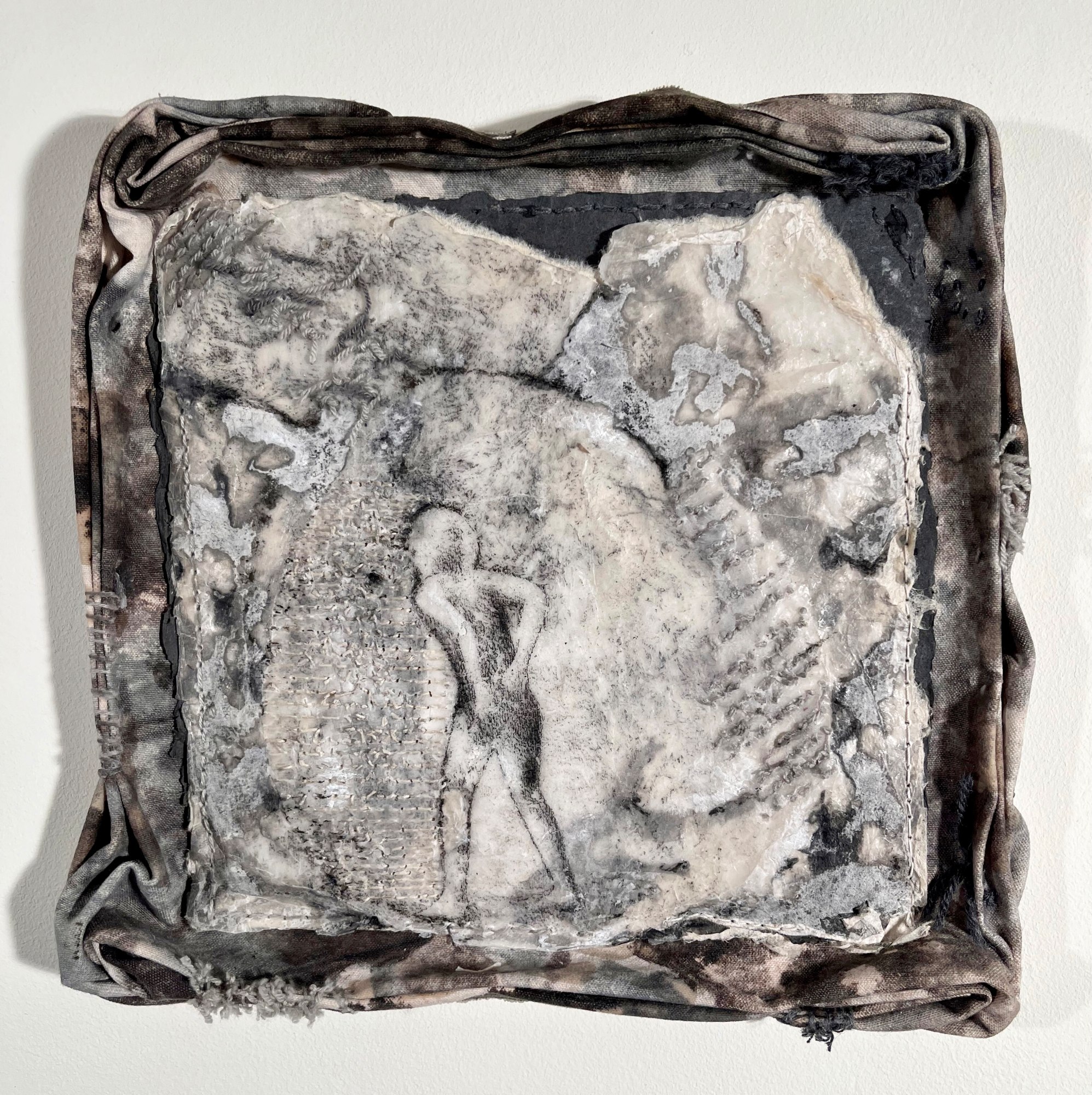 • Mixed media: artist made paper with pulp painting, photo transfer, crochet thread, yarn, beeswax, pastel, dyed and shaped canvas