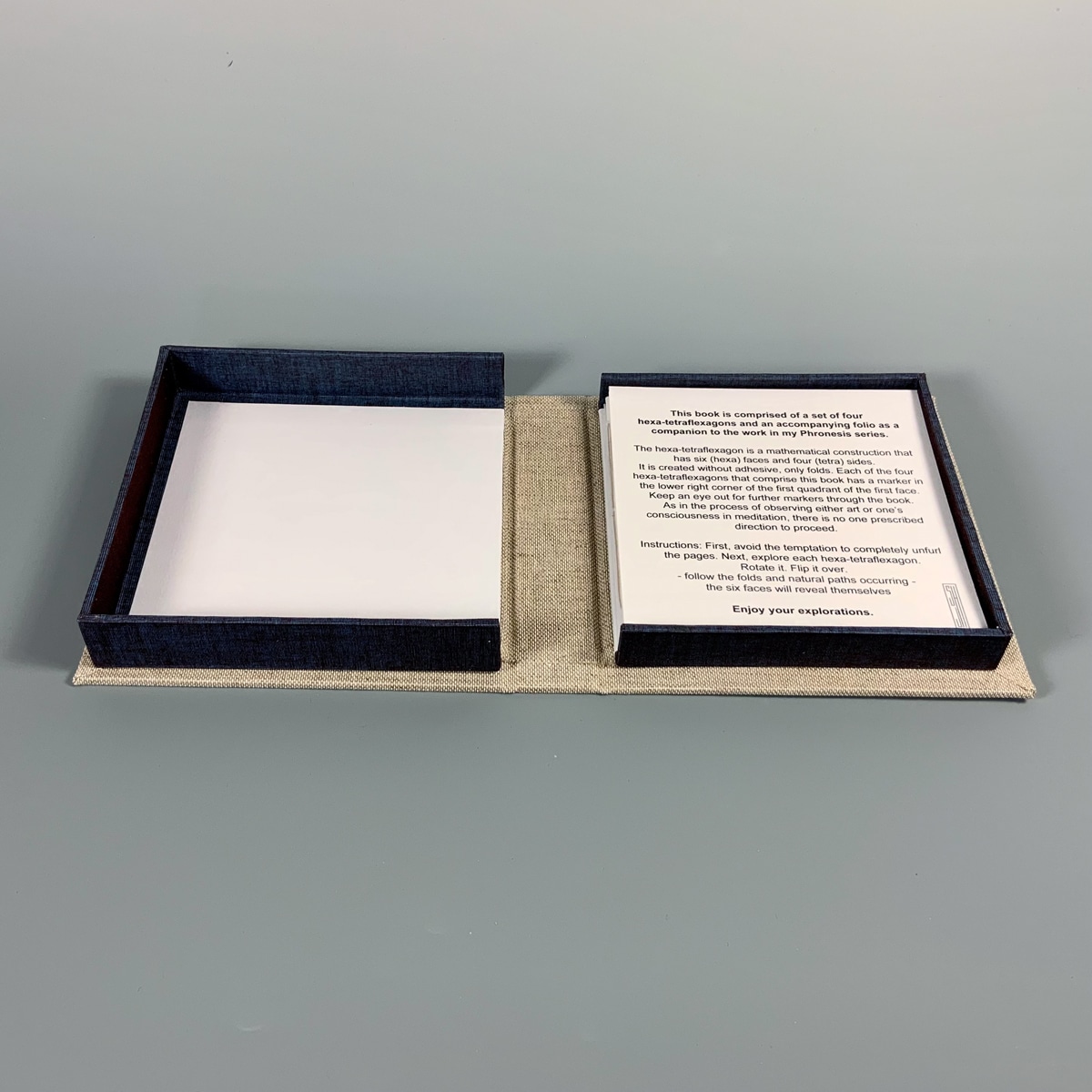 The Phronesis book, contains a set of four hexa-tetraflexagons (six faced, four sided folded forms) that the fold and open in different directions to reveal each of the six faces - with either text or an image from the series itself. Exploring these forms become a lot like the process of exploring an idea or even a piece of art.
