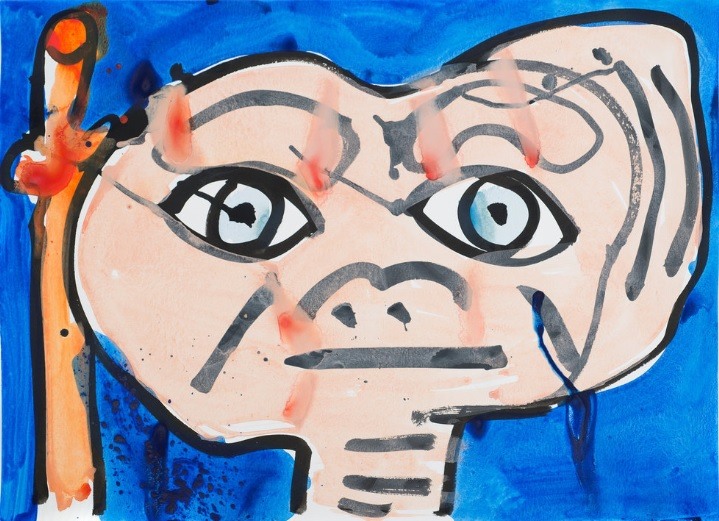 I am contributing proceeds from this work on paper to Know Your Rights Camp. It’s an educational camp set up by Colin Kaepernick that is helping people learn about how systems work and helping bring about change and justice. I made it in 2019, it’s an E.T. with his finger in the air. E.T. is pointing up and sees the bigger picture.