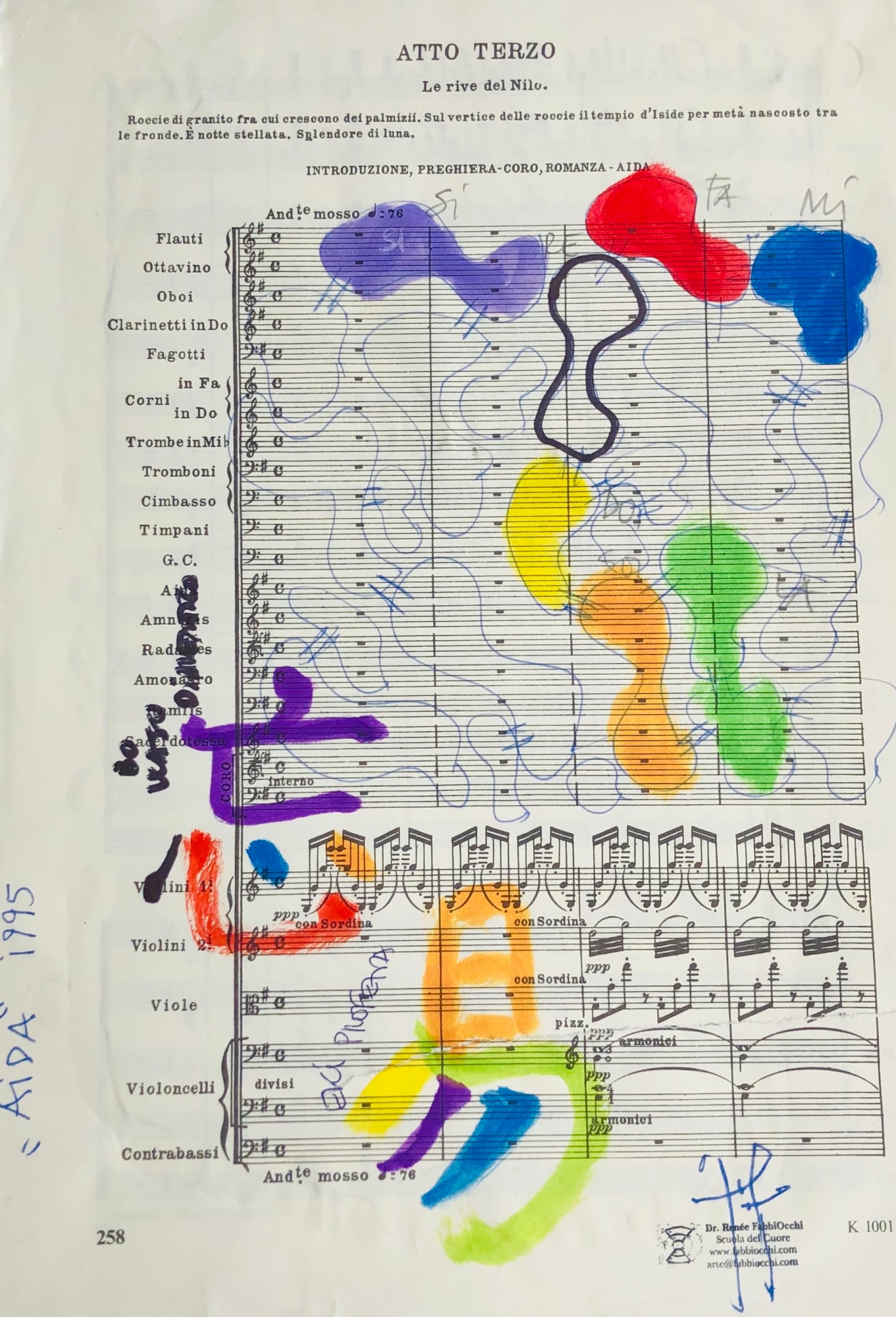 In that year I had begun working on the Giuseppe Verdi canvas, and I became very interested in this figure of a man with an iron character. I delighted in painting on his scores with soul forms and kanji, here the one exhibited is that of prophecy. - Room 43