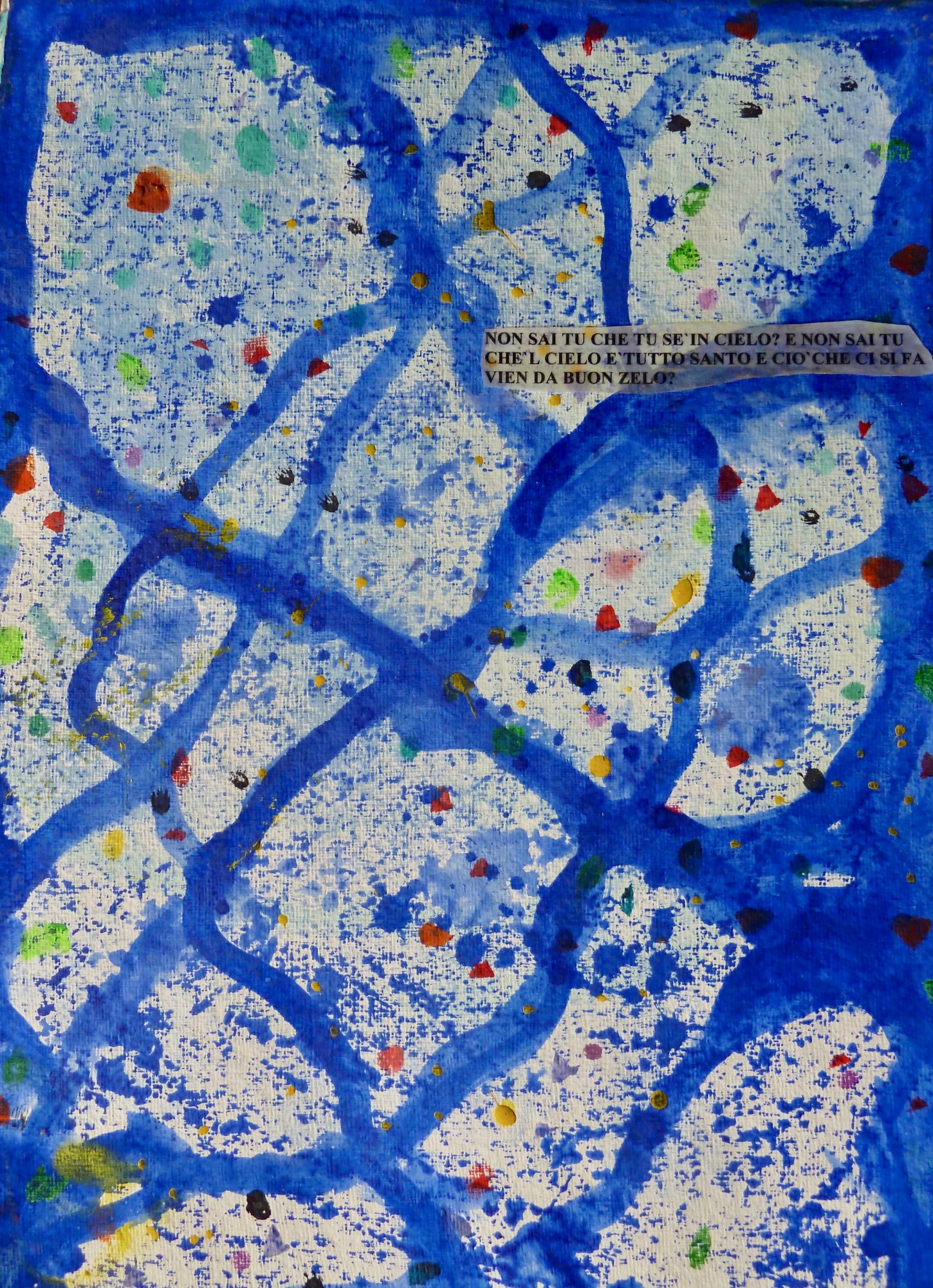 Bellissimo lavoro su carta fatta a mano che trasmette la dimensione magica del Paradiso dantesco del verso XXII, quando Beatrice spiega a Dante che sono vicini a Dio. Invita ad aguzzare lo sguardo .... "perché il Cielo è tutto santo e ciò che si fa vien da buon zelo." Sullo sfondo di tante piccole luci colorate una rete divina in blu mostra la spensierata dinamica celeste.
