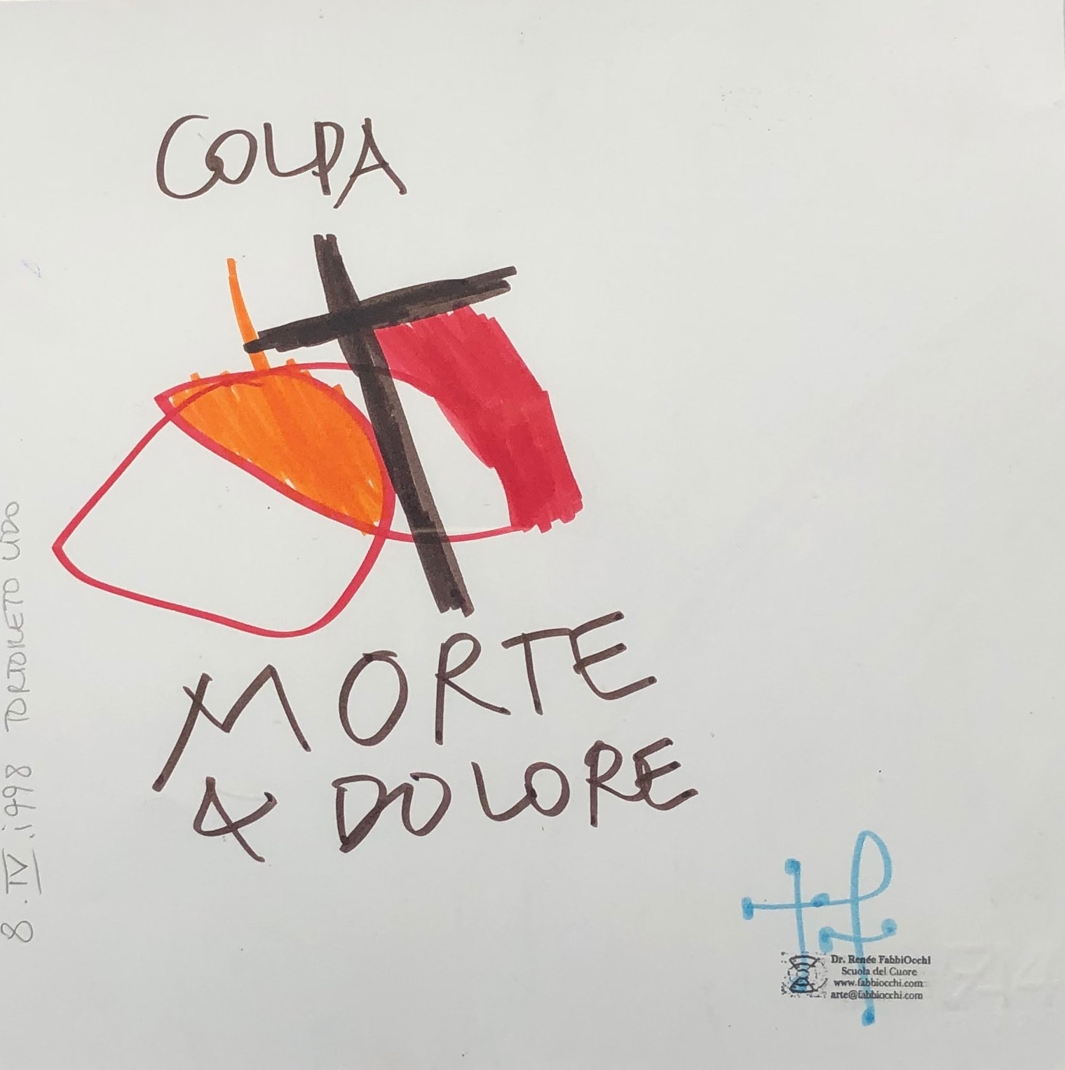 Un tema ricorrente e tipico negli ambienti chiusi e provinciali é quello della Colpa, soprattutto dare la colpa agli altri e mai assumersi le proprie responsabilità. Per affrontare in Luce le Ombre della mia Coscienza ho voluto disegnare questa Croce che mio Padre era solito ad aggravarmi. Nel momento in cui noi visualizziamo queste ombre, essendo state accettate, esse svaniscono come per incanto e perdono il loro potere. Quest'opera appartiene alla Serie di Terapie che io attraverso l'Arte ho rafforzato. Per me visualizzare é stata sempre una grande medicina, lo consiglio a tutti coloro che hanno problemi con le loro ombre.