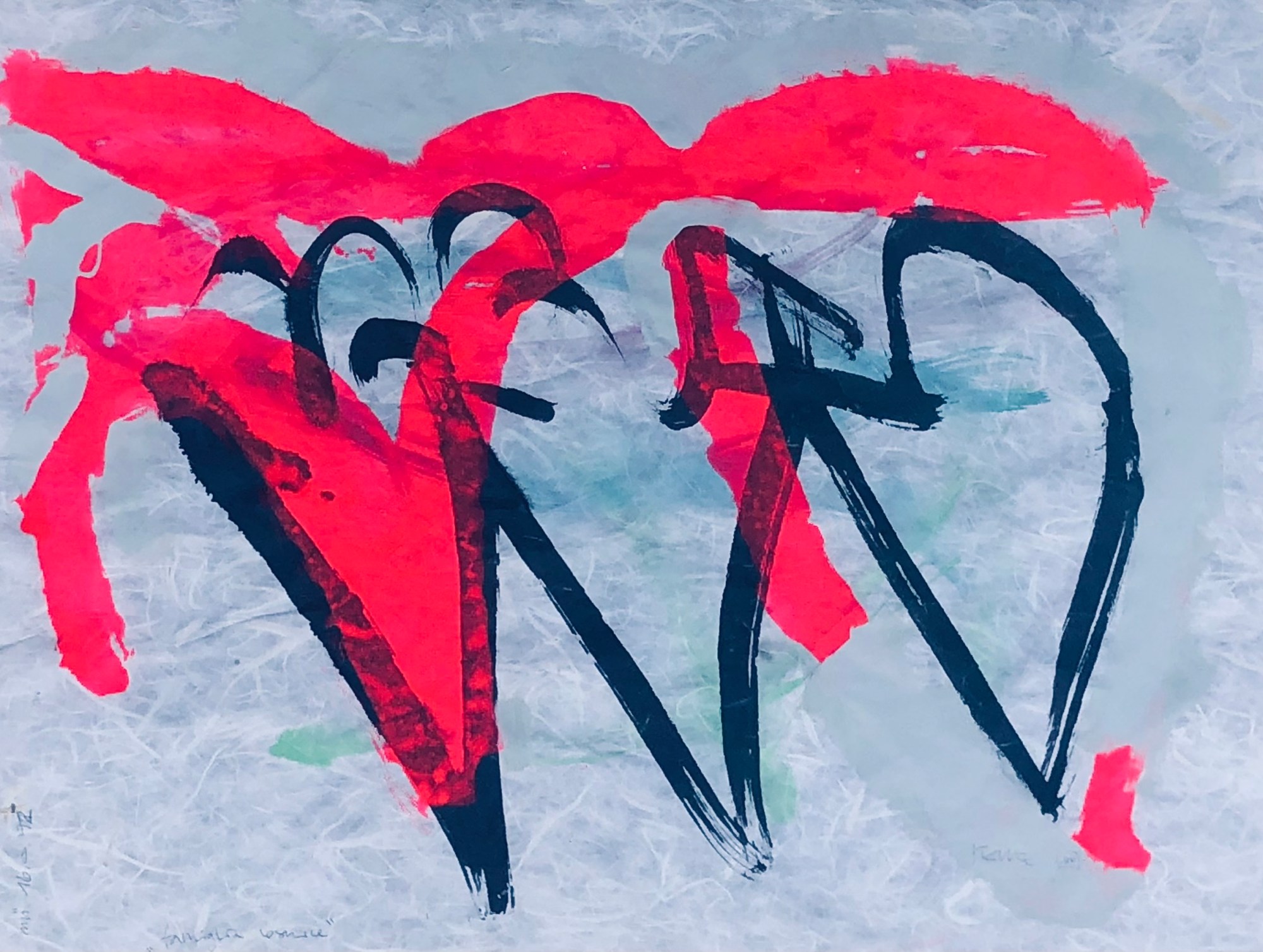 Painted in Munich in 1992, this work is a longing for a dreaming community. Three hearts on black calligraphy generate a new world-in fuchsia color-sum of the multiplication of the volume of hearts and the essence of love.