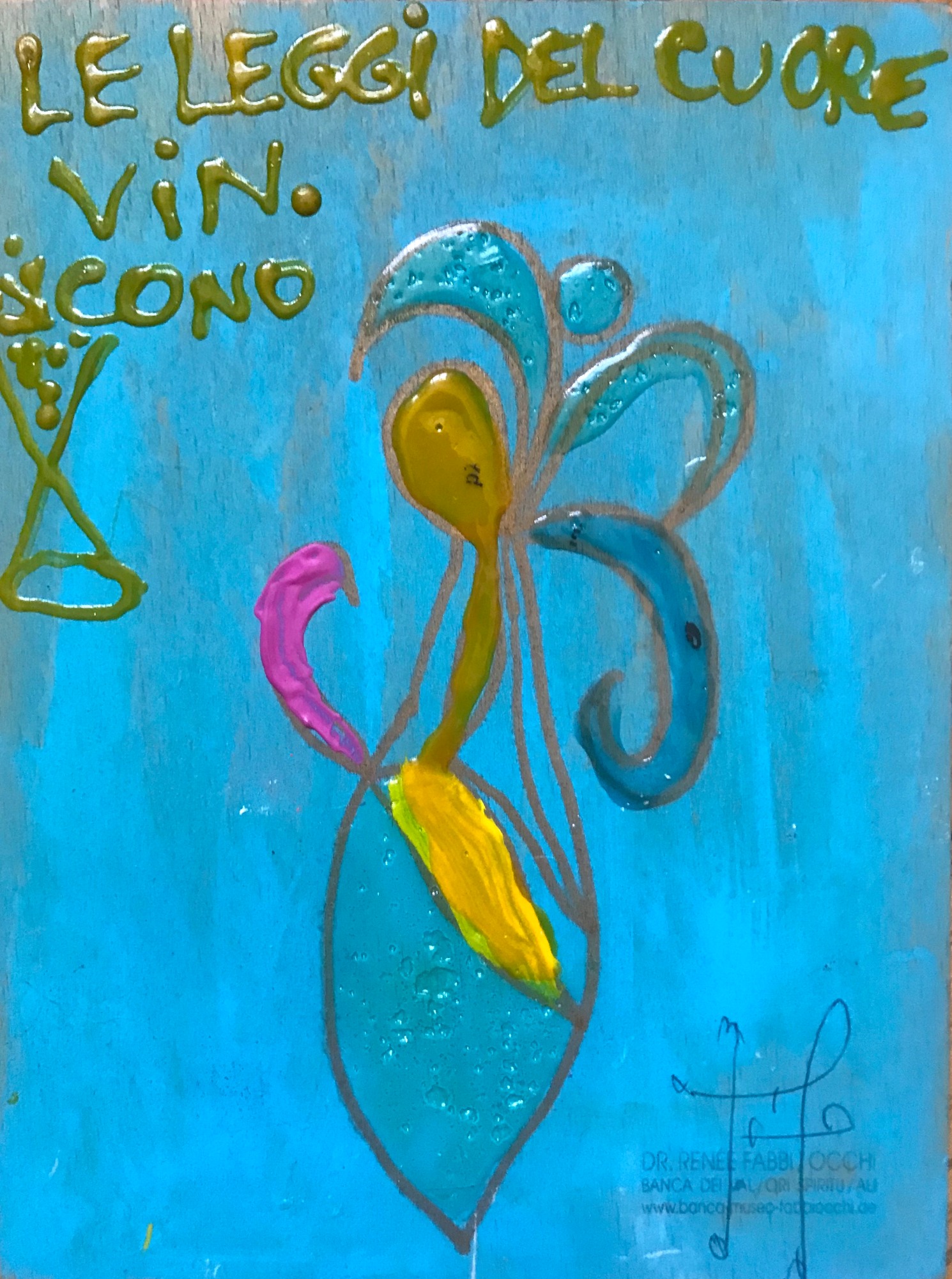 An angel drawn in gold appears in the form of a lily bulb on a blue background with the inscription in yellow: "THE LAWS OF THE HEART WIN". A yellow hourglass filled with small dots (or wine?) at the top completes the work.