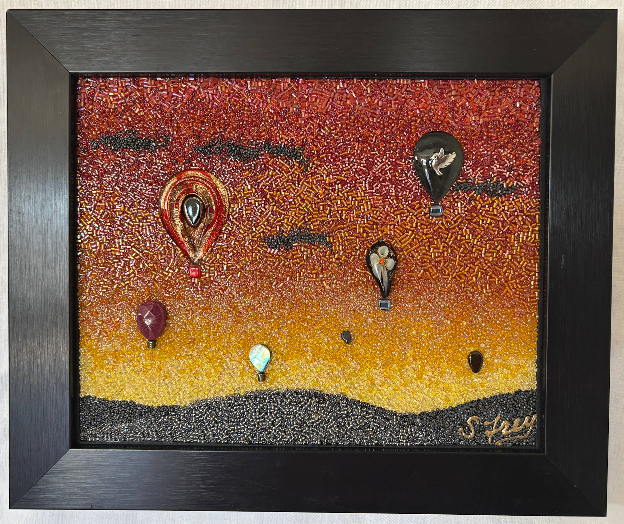 Mountain High captures a moment of quiet wonder as hot air balloons float effortlessly above a mountainous landscape beneath a transitioning sky. Crafted entirely from beads, the mosaic’s rich textures invite close appreciation—each balloon adorned with distinct colors and patterns that seem to carry their own stories. The sky shifts in subtle gradations, framing the scene with a serene twilight atmosphere while deep colors form the rugged peaks and ground below.