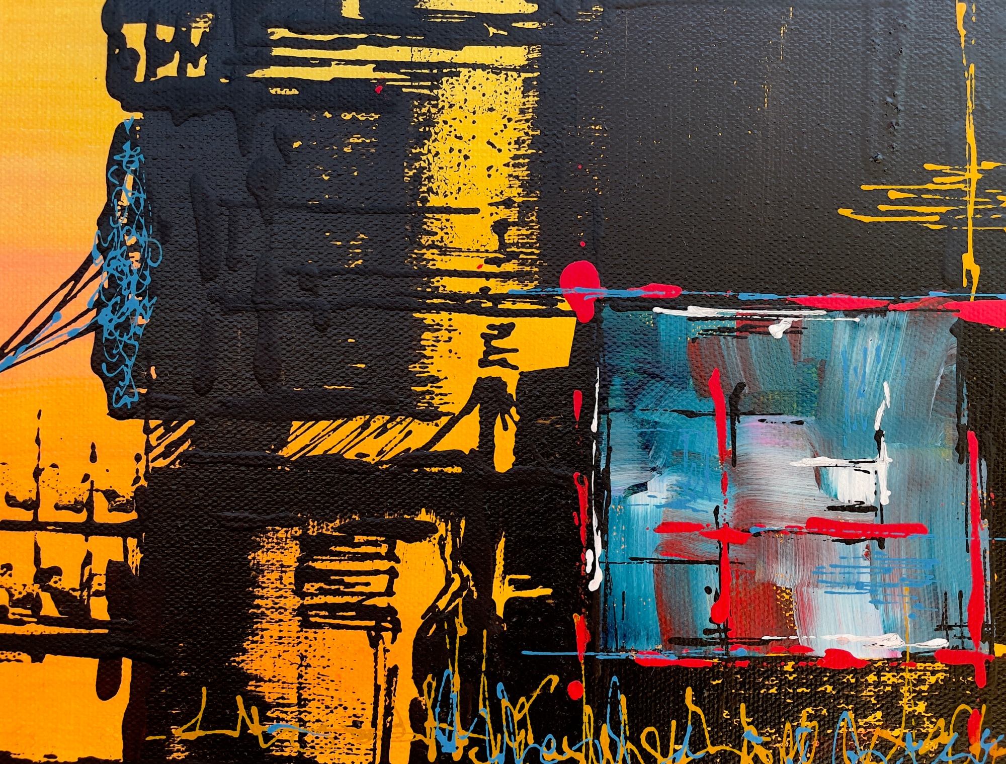 Civitas speaks to the complexities of attachment to place and objects, especially in urban environments, while exposing consumerism. Within urban landscapes, we surround ourselves with comforting tangible objects that might delight or serve us, yet we discard them as easily - when their charm no longer consoles us. Reminiscent of civic or industrial landscapes, the black shapes wander across the canvas, conjoined by scrawls and blocks of colour to emphasise the duality of separateness within connectedness. The viewer is further confounded by the ambiguous, almost floating composition, alluding to the nebulous and fleeting consolation of material things.