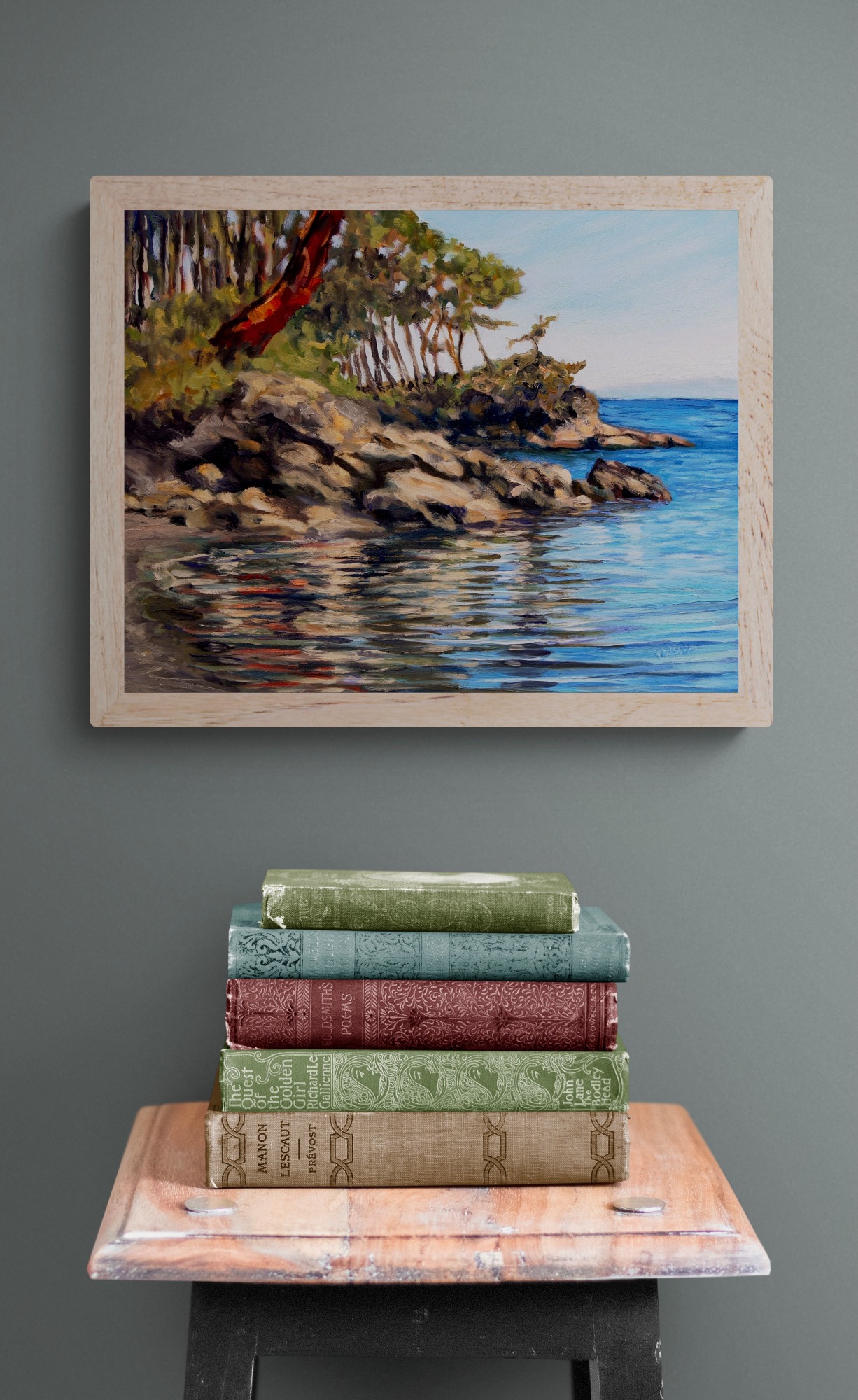 Artist notes: I set up the easel just before eight in the morning. The tide was going out fast so there was no time to waste. An hour later, the painting was mostly there and I was cold from standing in the shade facing a soft northwest wind. I took the painting back to the studio and two days, still feeling like the tide was receding before I could finish, it is done.