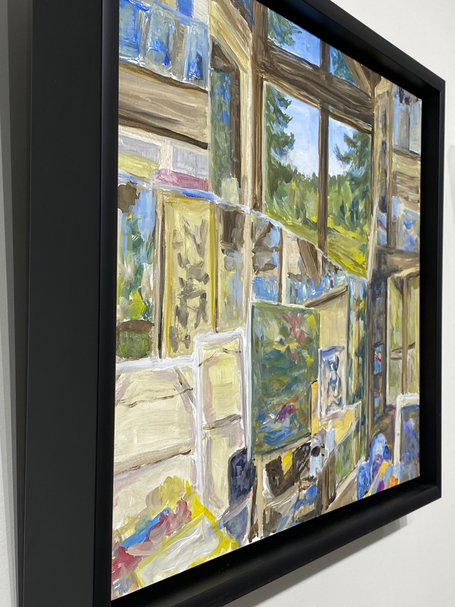 Artist notes: As a landscape painter, my studio is often the last place I want to be on a sunny summer day when I can actually be outside gathering references or plein air painting. This painting is derived from a collage of four of my images that I used as a reference. While standing in the actual studio I was painting, I continued to make further observations. There are elements of an inside view where my brain is gathering everything up that is being experienced in this space and calling it “my studio” and then leaving me with a painting that only my heart can recognize.