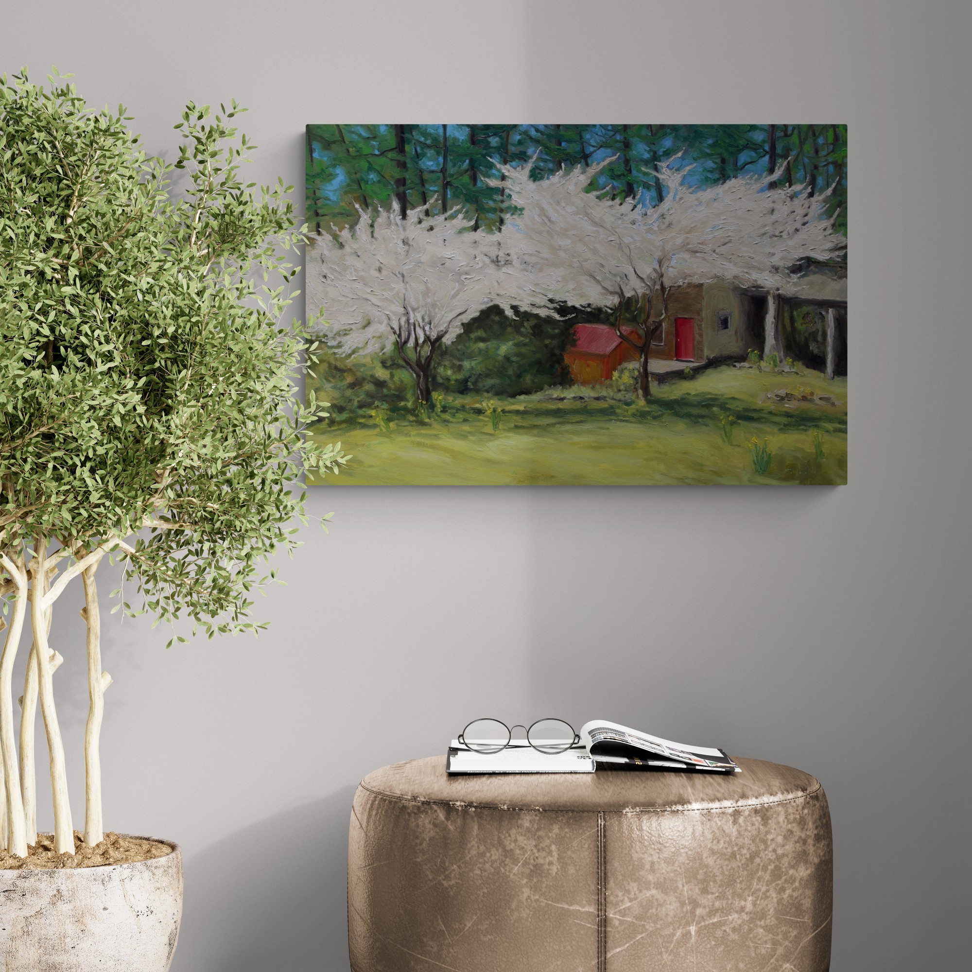 Artist notes: In our neighbourhood there is the most beautiful formal garden with roses and box hedges. But it is the more random patch outside the fence of that garden where the plum trees bloom each spring that gets my attention and inspires this painting. I love the rather wildness of the plum trees with the splashes of red on the door and roof of the buildings in the background.
