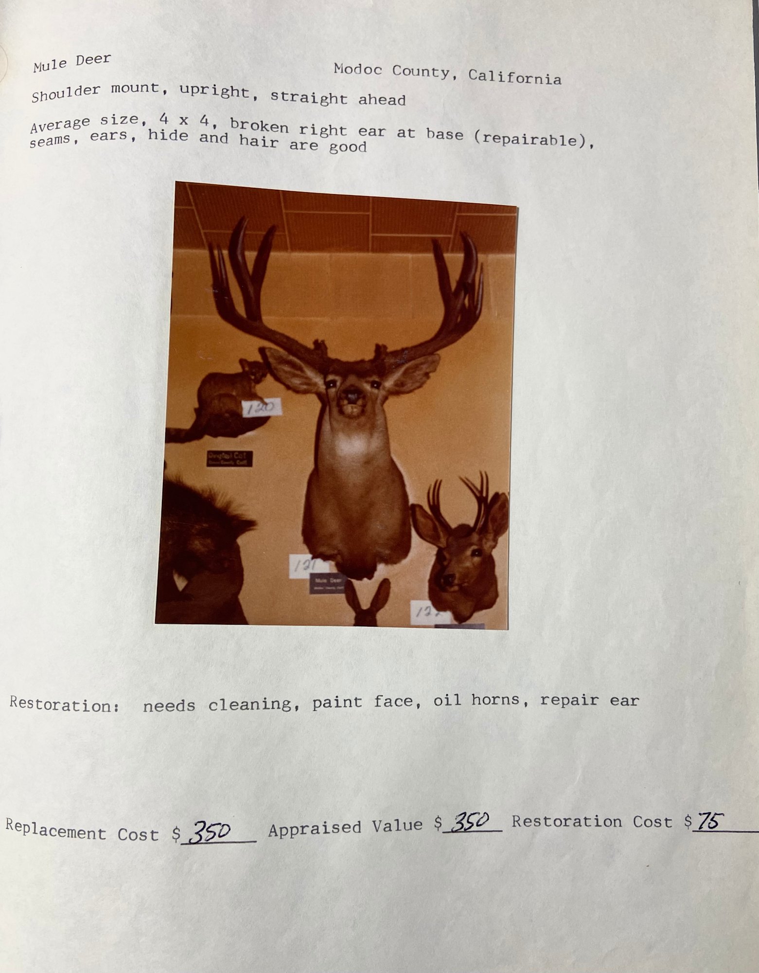 Each mount is named, as well as numbered for easy identification. Condition notes are available with every photo, as well as a 1983 appraisal by master taxidermist, Jack Perry.