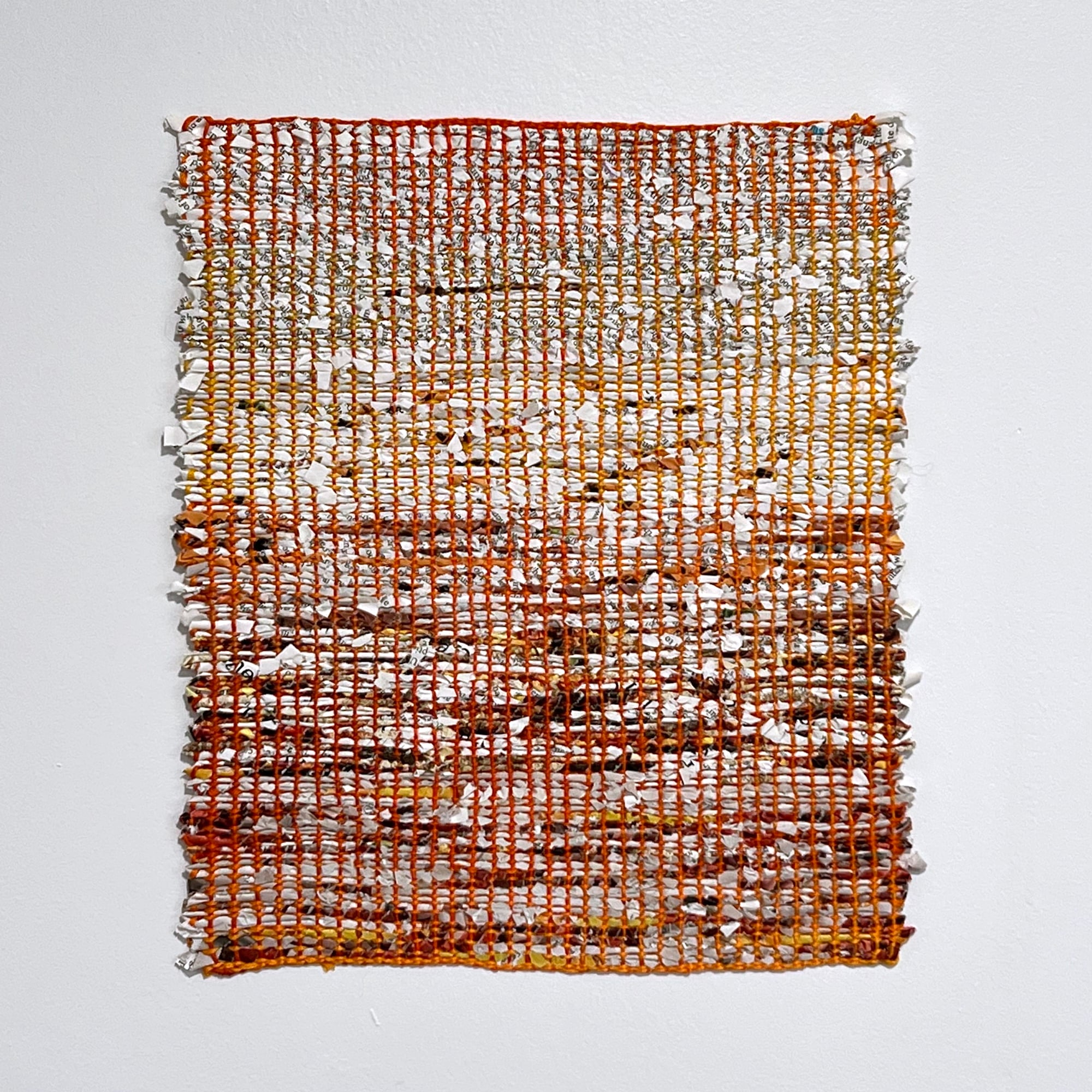 • Shredded, spun, woven New York Times Magazine from Aug. 20, 2023: “They Lurk Inside Our Everyday Stuff. What Are ‘Forever Chemicals’ Doing to Us?,” embroidery thread, fragments of text saved from the cover article