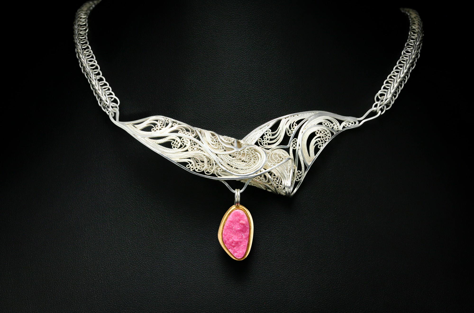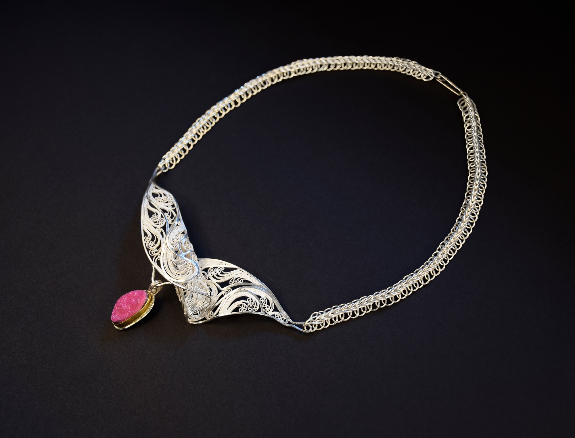 I love to create sculptural objects with the technique of Russian filigree. I draw the dimensional designs first then mentally unfold the structures, redrawing them as they would be flattened out. I then use these drawings to create paper models to test how the finished structures will bend. My paper models provide templates for the Russian filigree frame designs that I eventually curve and form into the finished sculptural pieces after I solder all the tiny tension fitted wires into place. I named this type of 3D filigree structure a Fabric Fold.