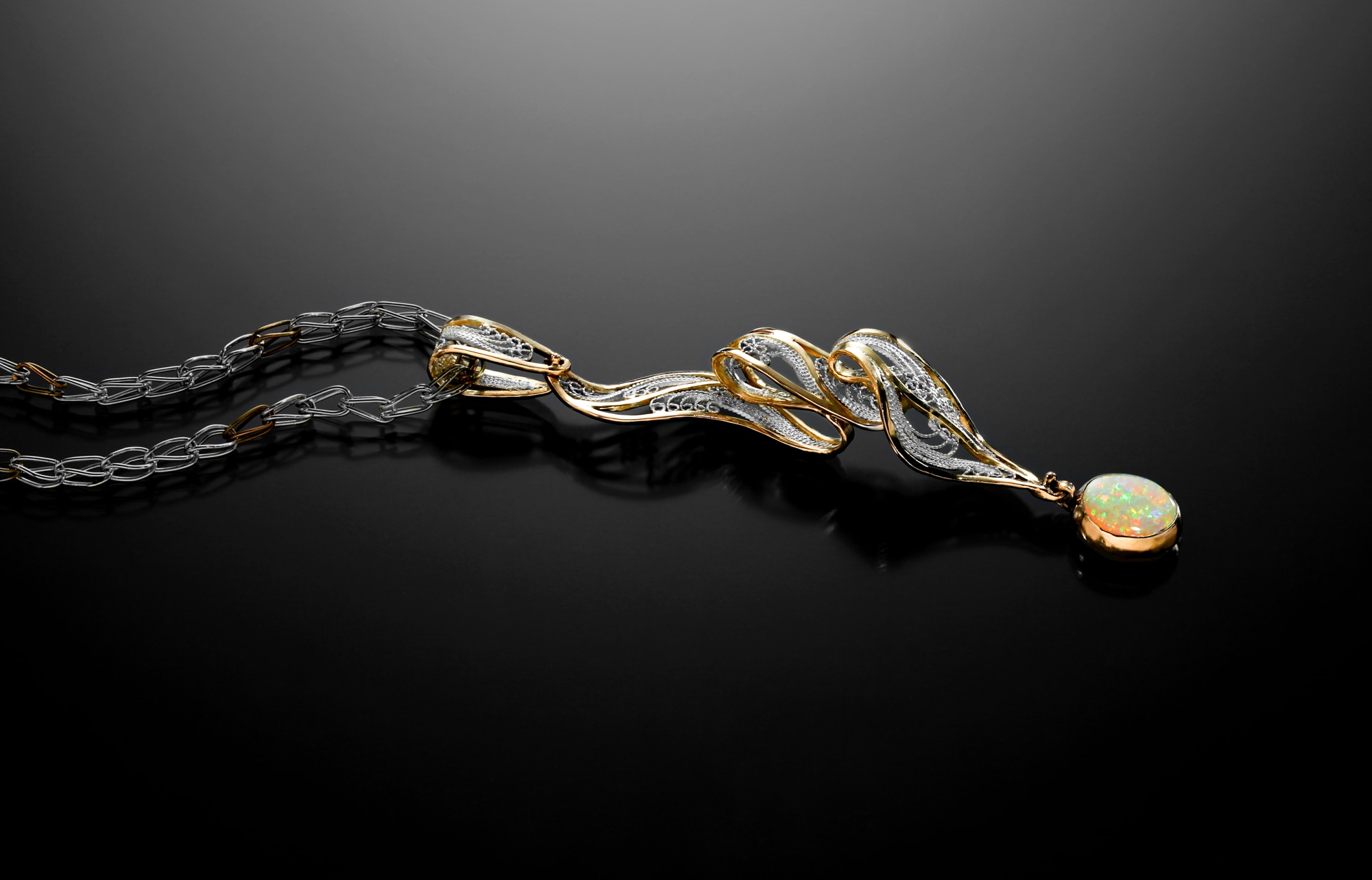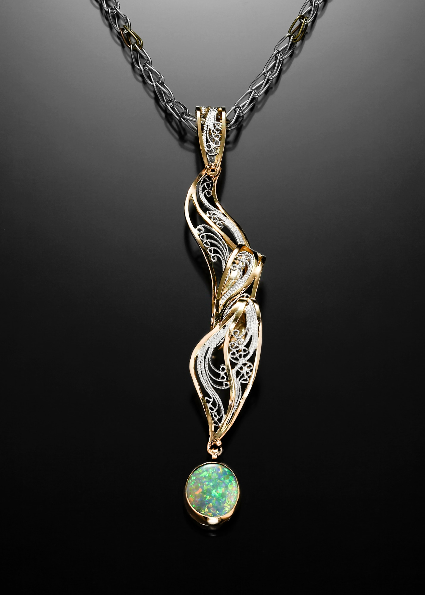 The Koroit (a type of Boulder opal) is exceptional in its flash so it and the metal reflect their brilliance into each other. I set it in 22k yellow gold for contrast. I fused, shaped, and wove the very delicate Roman chain links to create a pattern with both the matching, deep 18k rose gold and fine silver.
