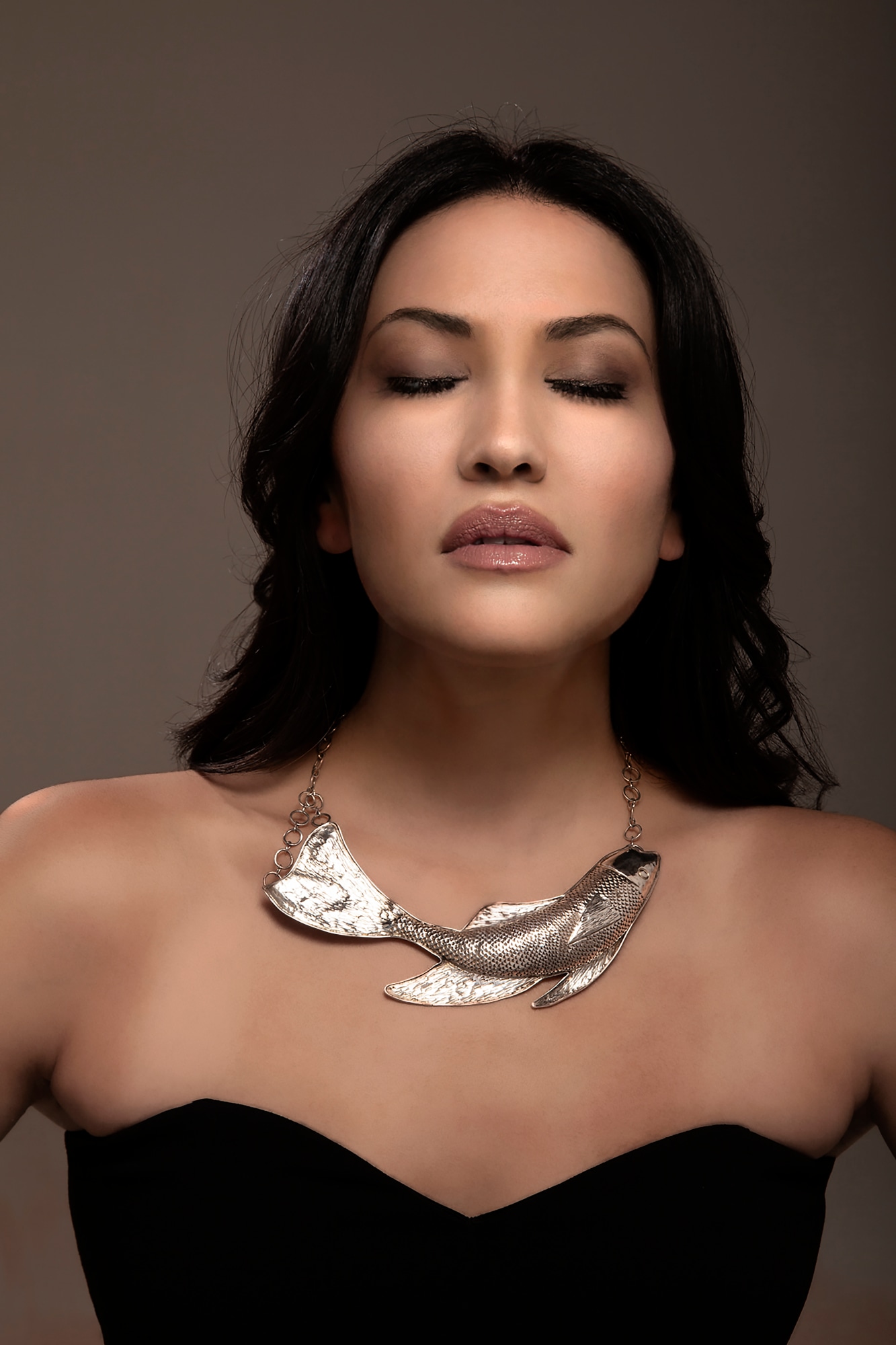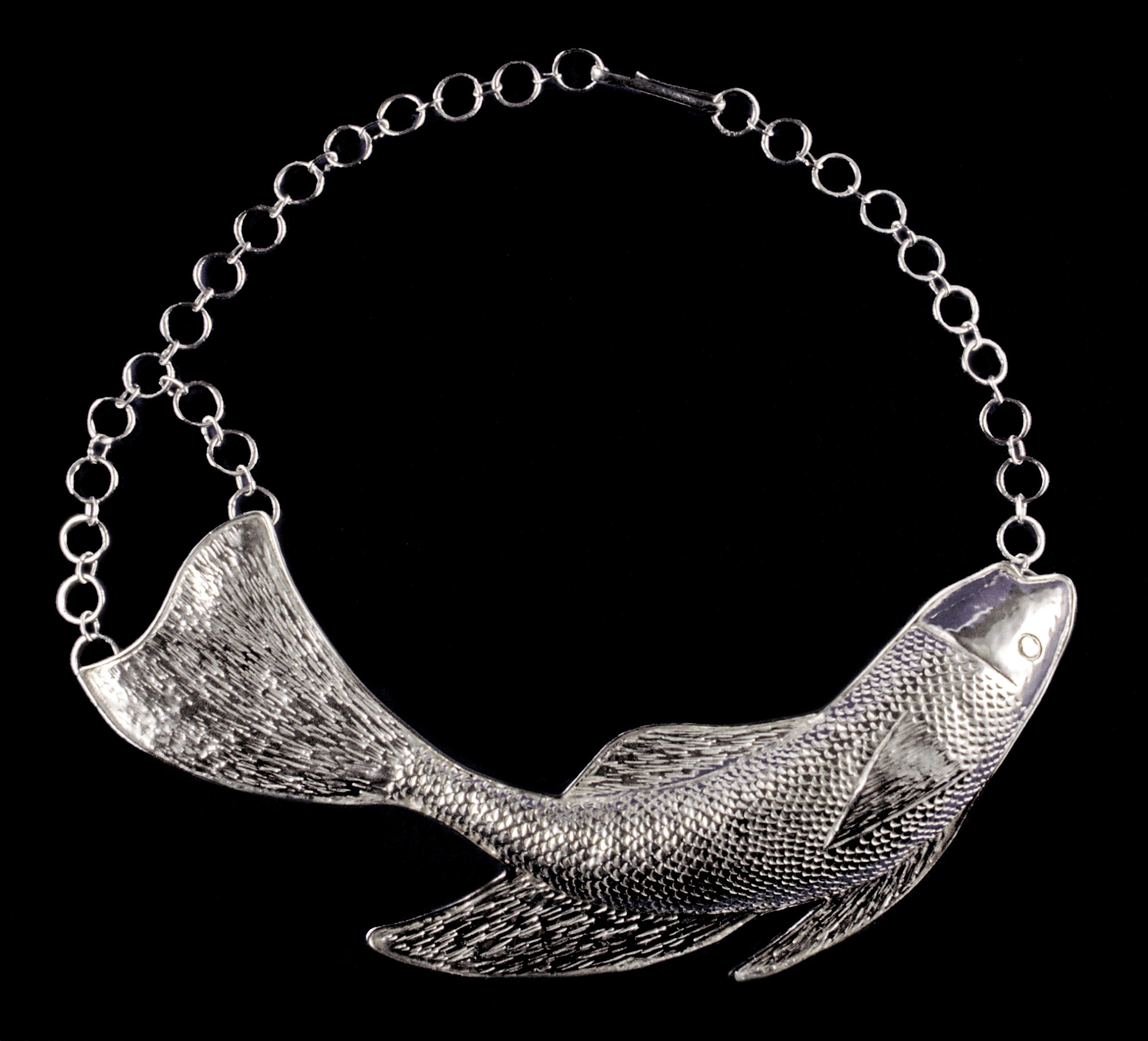 The right person will give it a good home, (feed it regularly, take it for walks, etc). I repoussed the fish from a single sheet of sterling and chased each scale with a tool I carved specifically for that purpose. The fish is specially curved two ways to ensure it lays well across the upper chest and collar bones. I designed and forged the chain to mimic bubbles that the fish might blow near the surface of the water.